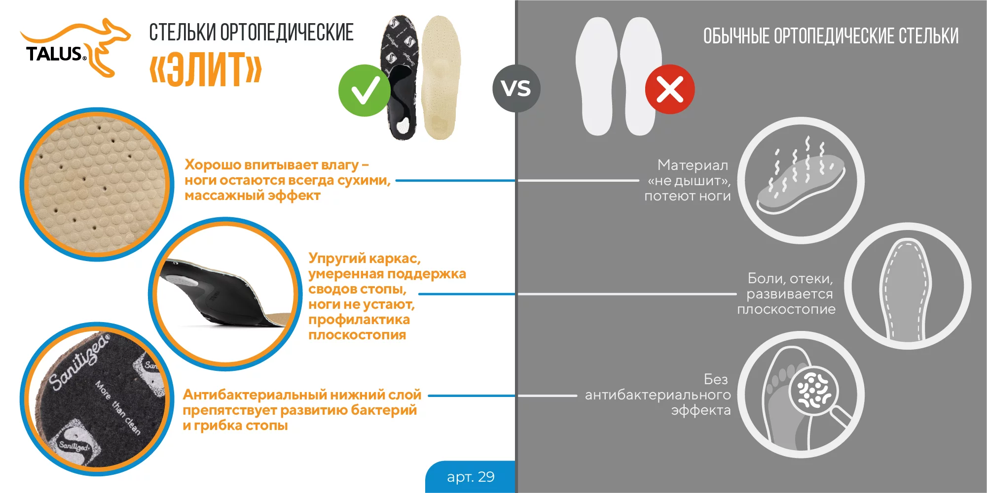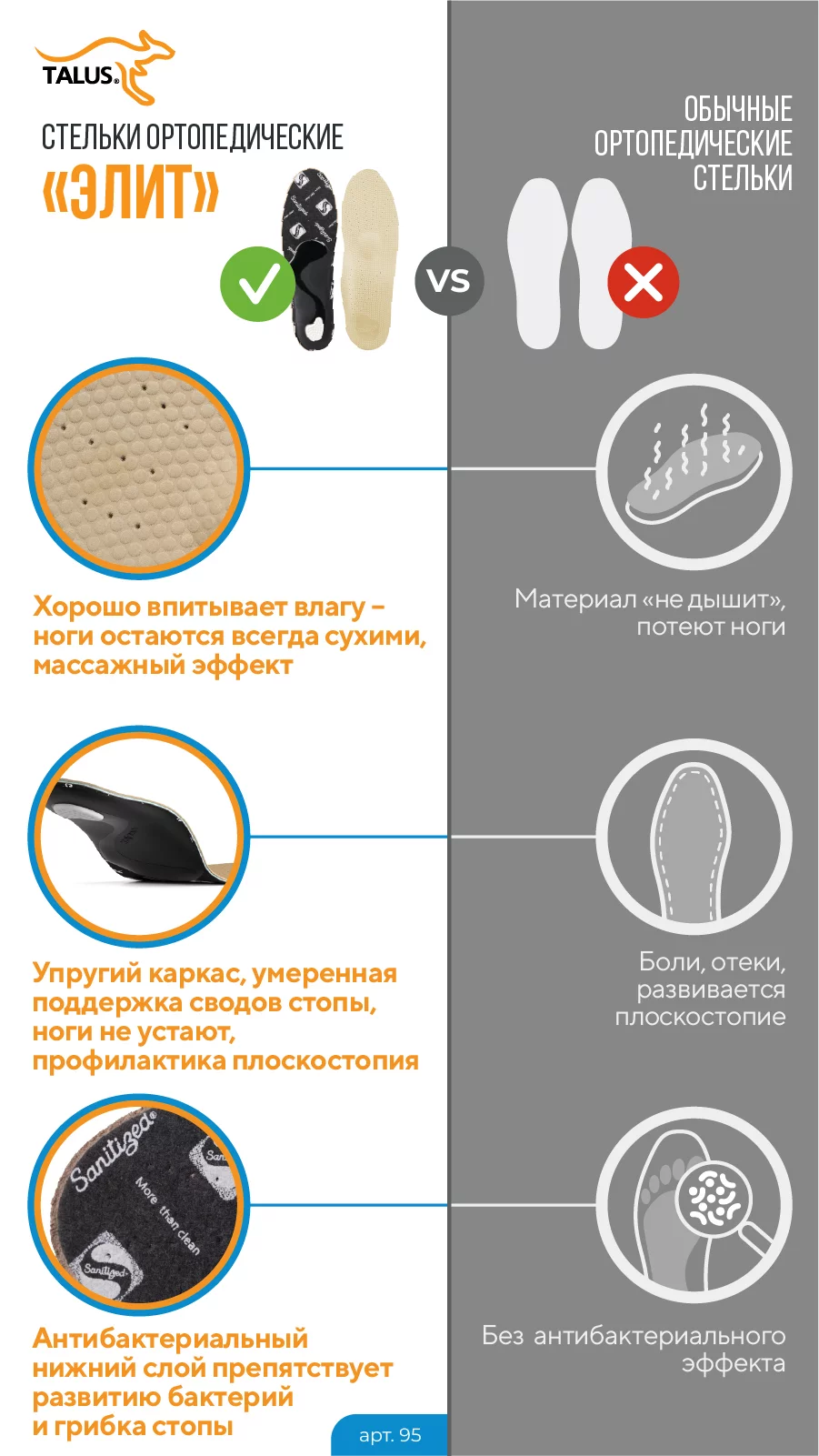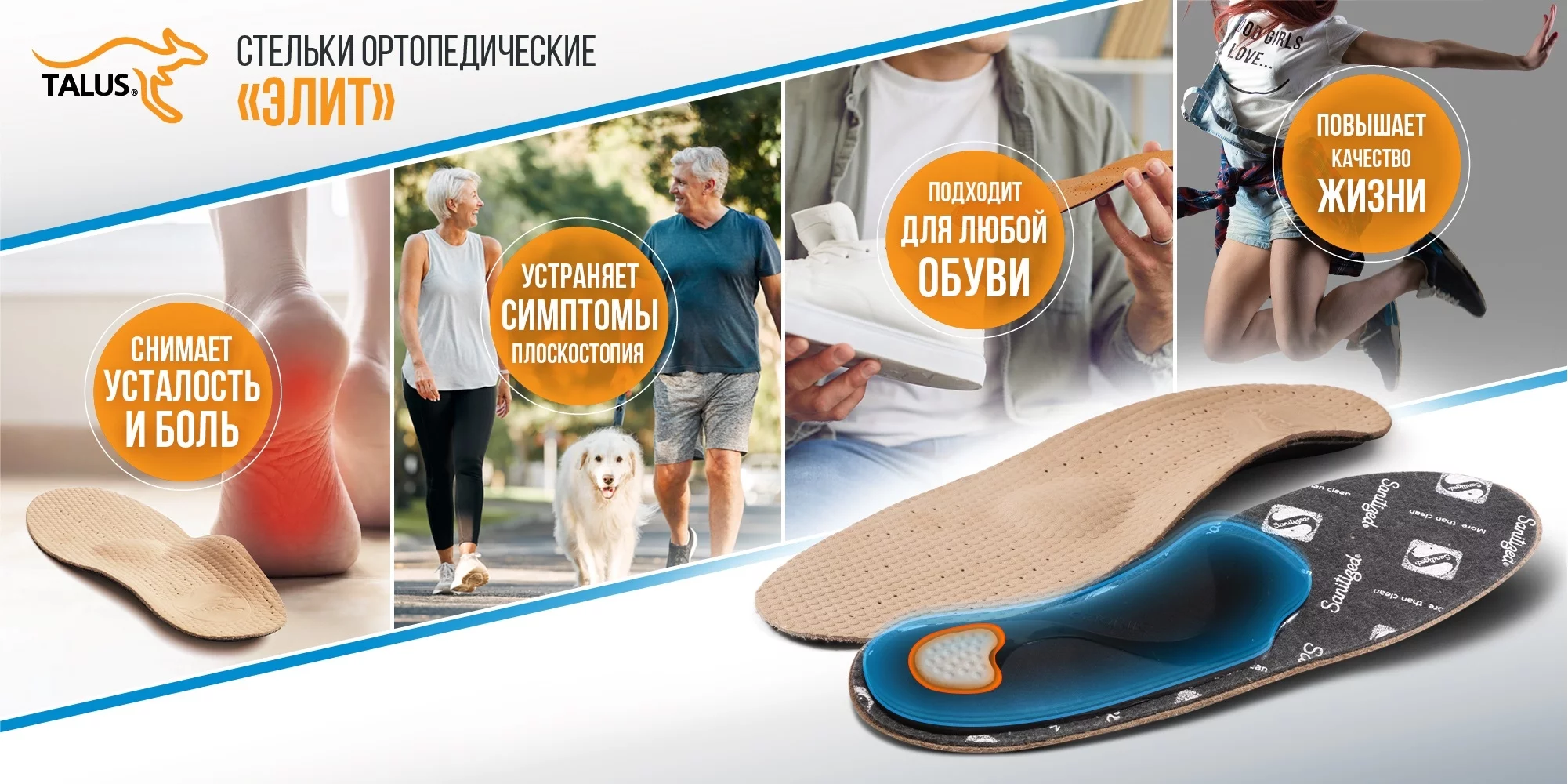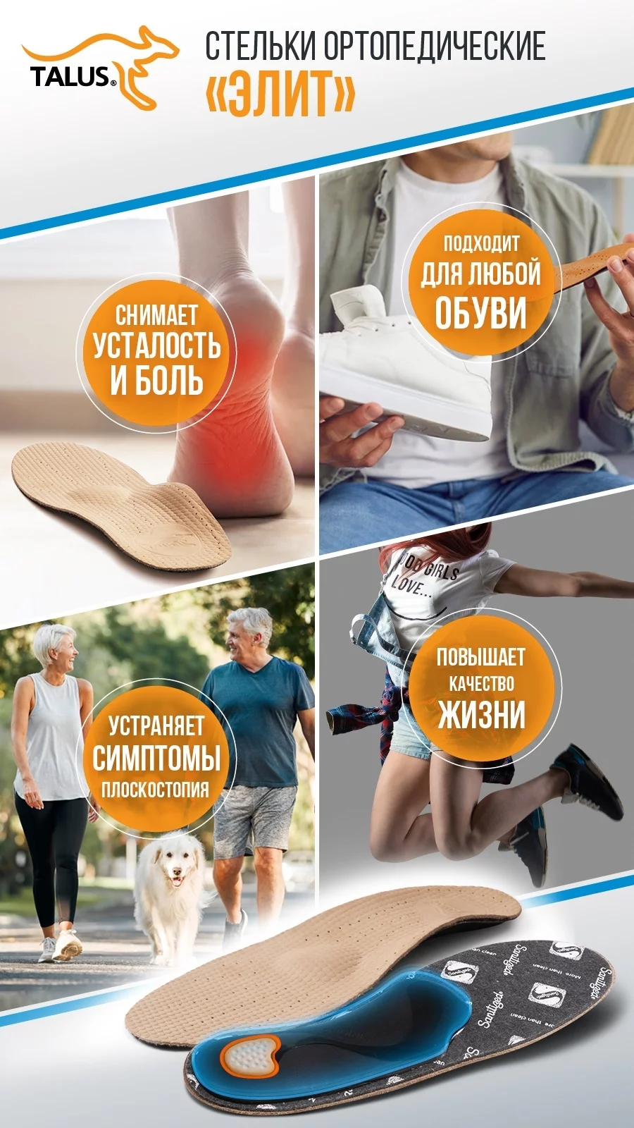 Здравствуйте дорогие читатели... С недавних пор стала ценителем ортопедических стелек.Первыми были зимние стельки Талус на шерсти и осенне-весенние стельки Талус каркасные. В этот раз решила еще в кроссовки подобрать стельки. Путем переставления из одной обуви в другую как-то пока не получается, так как все обувь разная и по ширине стопы и иногда чуток и по длине бывает разница.В этот раз выбор был пал на каркасные стельки элит, которые очень и очень похожи на упомянутые выше.Форма у этих стелек почти один в один как у каркасных обычных, только поверхность с пупырышками, менее скользящая. И ей приписан эффект массажный плюсом. Выпуклость под свод стопы умерено высокая, как и в вышеупомянутых простых самых дешевых каркасных стельках элит, форма почти та же...Обратная сторона хорошо уплотнена и на большей части стельки пластиковый прочный литой каркас. Под пяткой амортизирующая подушечка.Плюсы стелек хорошо описаны на упаковке, помимо разных видов плоскостопия в назначении еще поддержание свода стопы и уменьшение нагрузки на суставы и позвоночник, в следствии чего уменьшения боли. Мне сейчас это наиболее актуально после травмы.Стелька из не очень широких. Хорошо поместились в мои новые кроссовки Тайм Ждамп.После месяца ношения стелек было замечено существенное уменьшение болевого синдрома в области стопы и коленей, в них я даже смогла впервые после травмы поиграть в теннис.Нога к ним быстро привыкает и чувствует себя очень комфортно.К тому де, благодаря пупырчатой поверхности, стопа не скользит, как это было в случае простых стелек этой же фирмы. Цена, конечно, у них недешевая, но я ни дня не пожалела о покупке, комфорт ног и безболезненность дороже всего.Ортопедические каркасные стельки Talus Элит - Удобные,подходят для более узкой обуви и некоторых кроссовок.Достоинства: Удобная форма, антискользящая поверность,умеренно высокий подъем для поддержания стопы